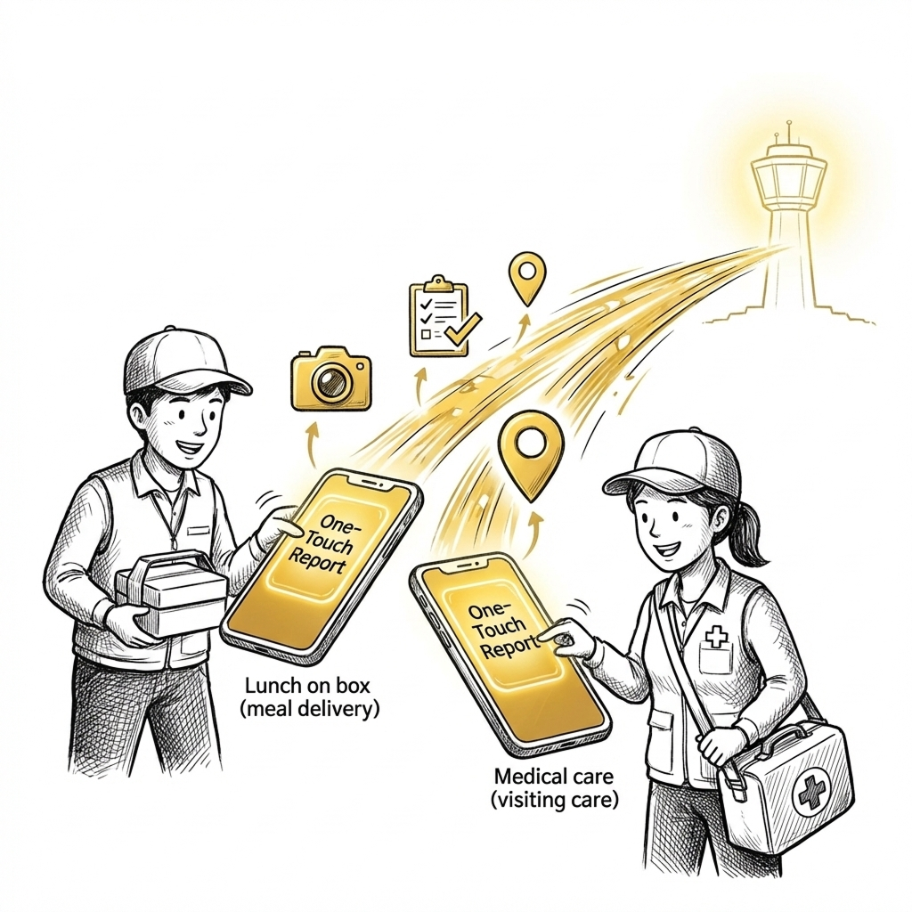 도시락 배달, 방문 진료 등 현장 인력이 사용하는 모바일 최적화 시스템입니다. 복잡한 행정 절차 대신 '터치 몇 번'으로 실적을 보고하는 것에 집중합니다.